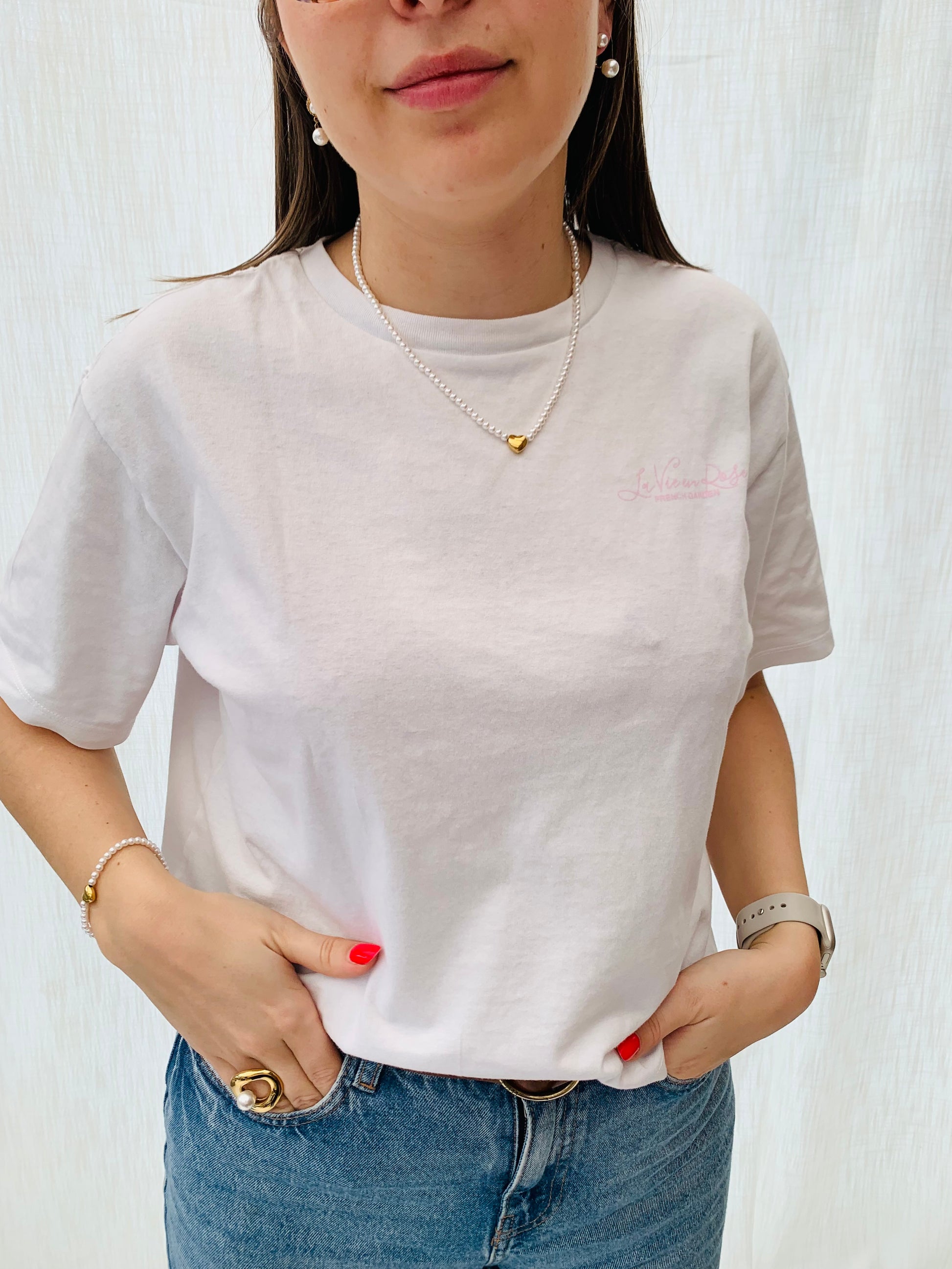 - Gouden armband met witte parels en een subtiel gouden hartje.Â