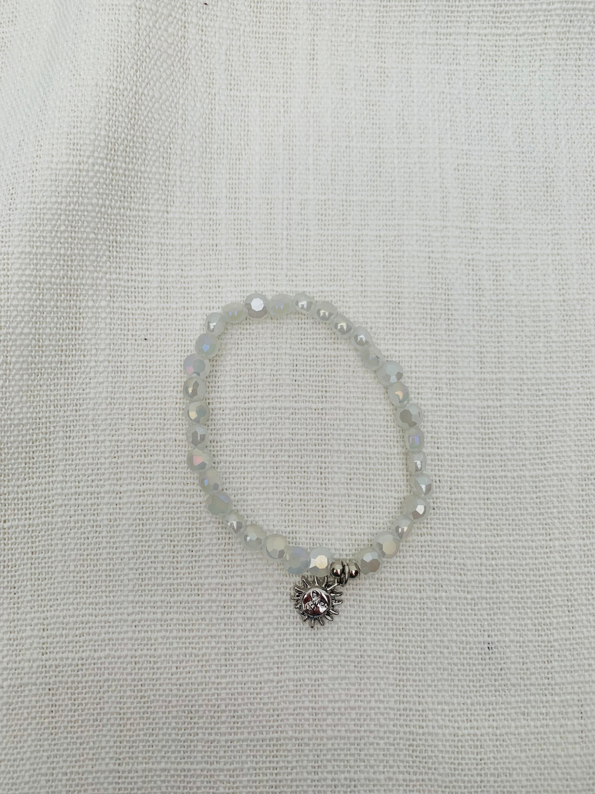 - Rekarmband met witte parels. Met een klein hangertje in de vorm van een zon.