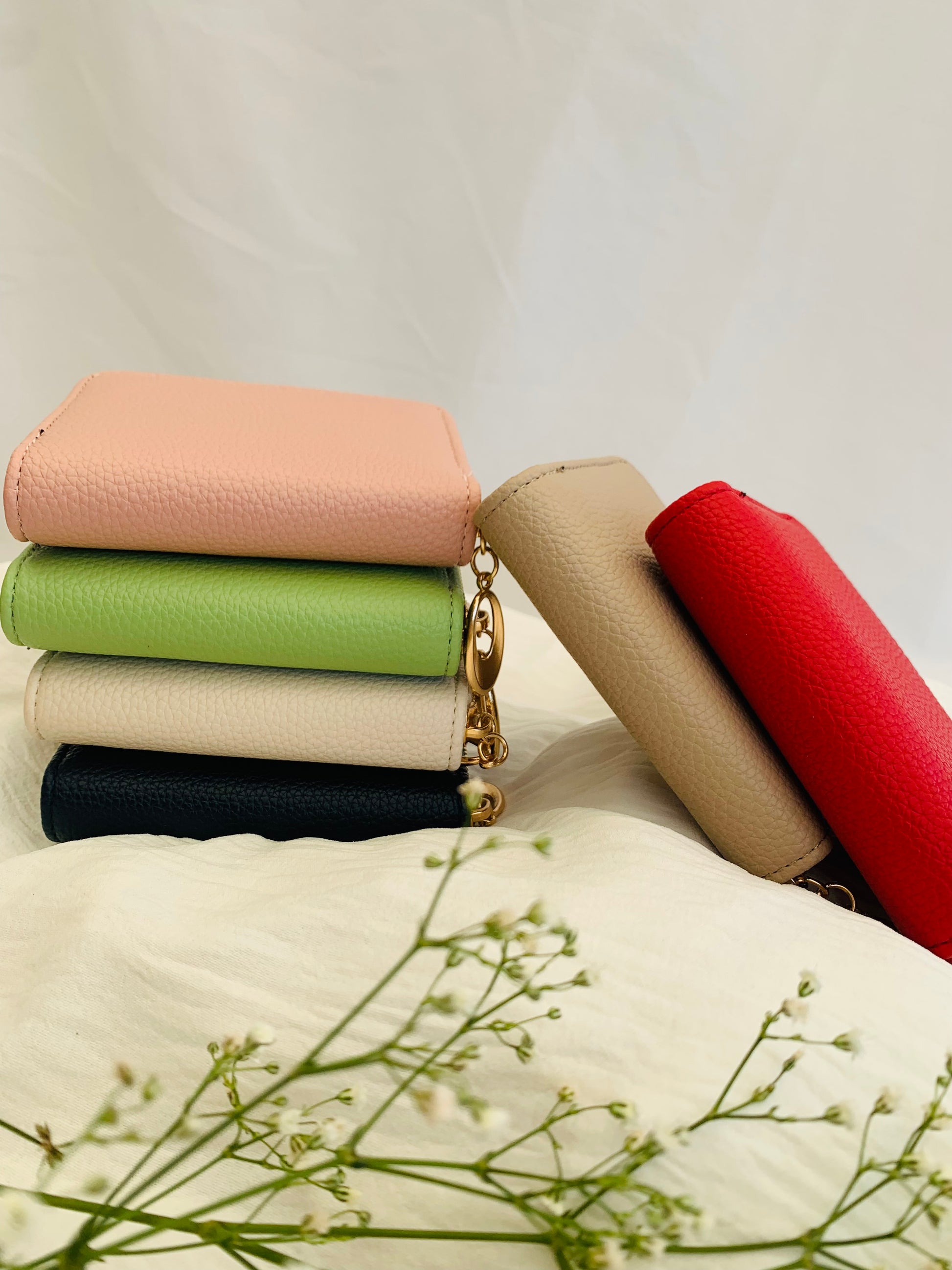Portemonnee verkrijgbaar in 6 kleuren: rood, lichtroze, taupe, wit, muntgroen en donkerblauw.